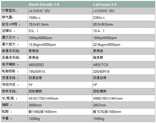 LaCrosse 2.4與3.0升車型在外觀方面只有少去車頭Buick立徽、由九幅式17寸鋁圈降級為七幅式16寸設定及車頂取消跑車式短天線等處不同,在車色選擇上則多出藍/白兩種車色,極為有限的差異若不細看還真難以在第一時間分辨出來。對于預算有限的精打細算型買家來說,可以更實惠的售價坐擁氣派外觀,相當劃算。